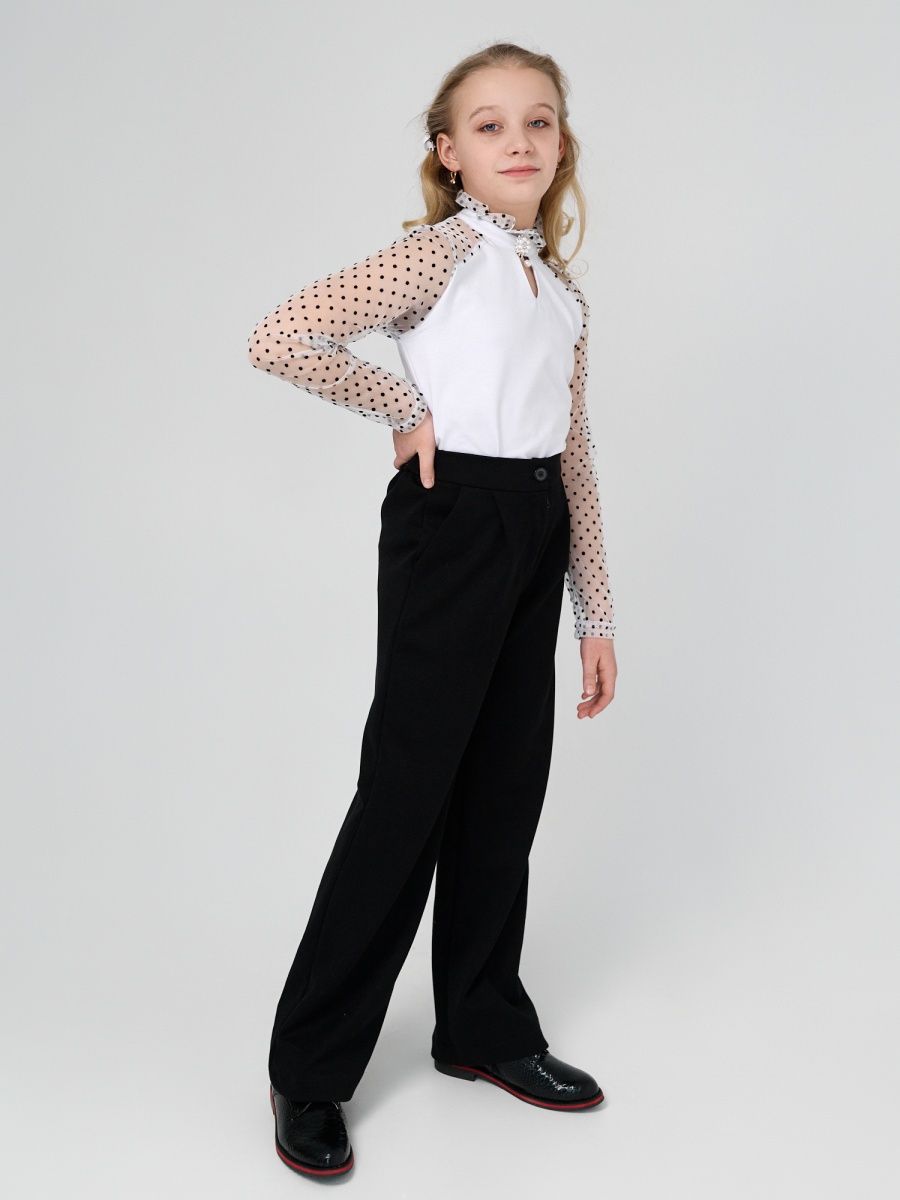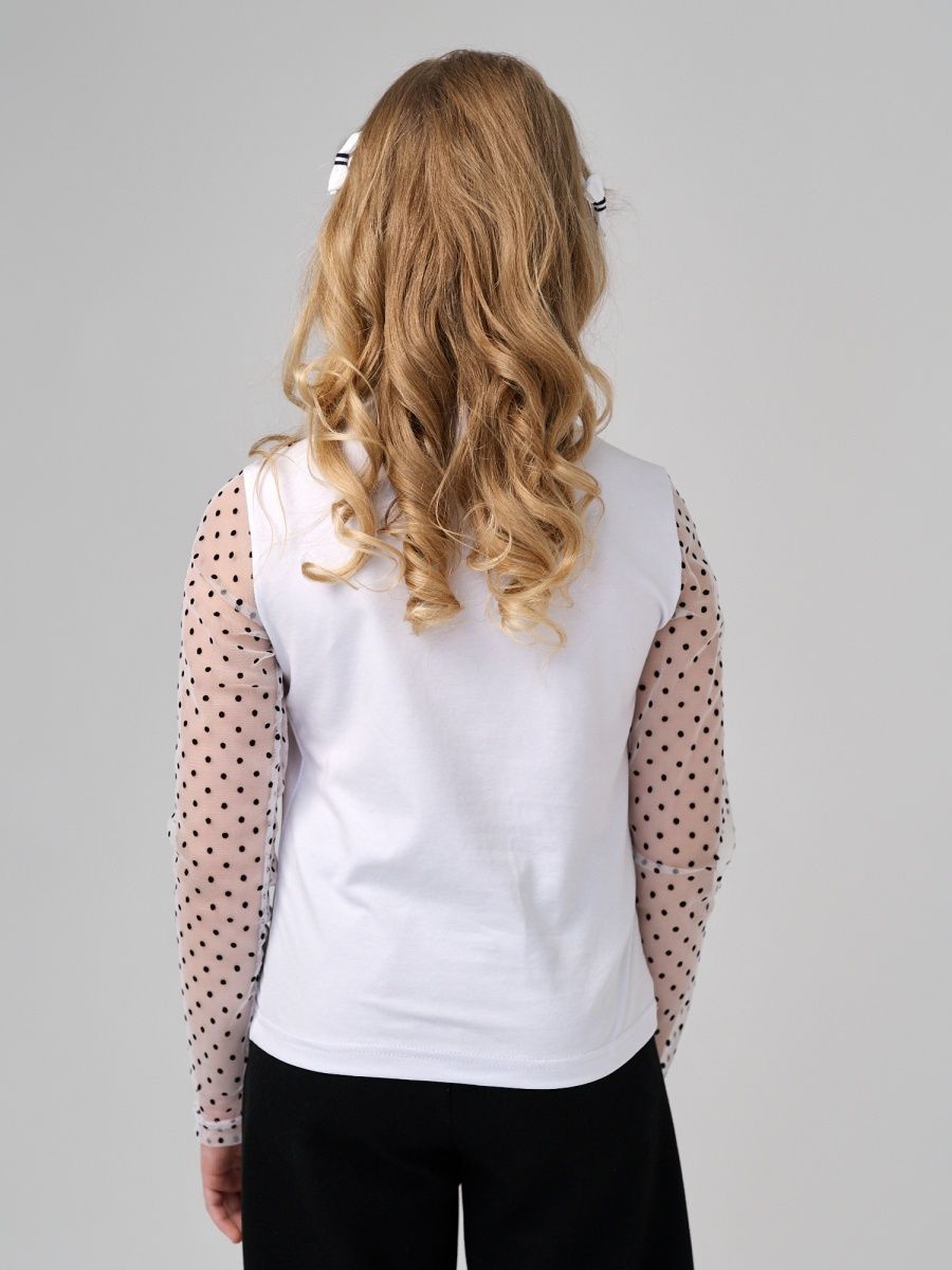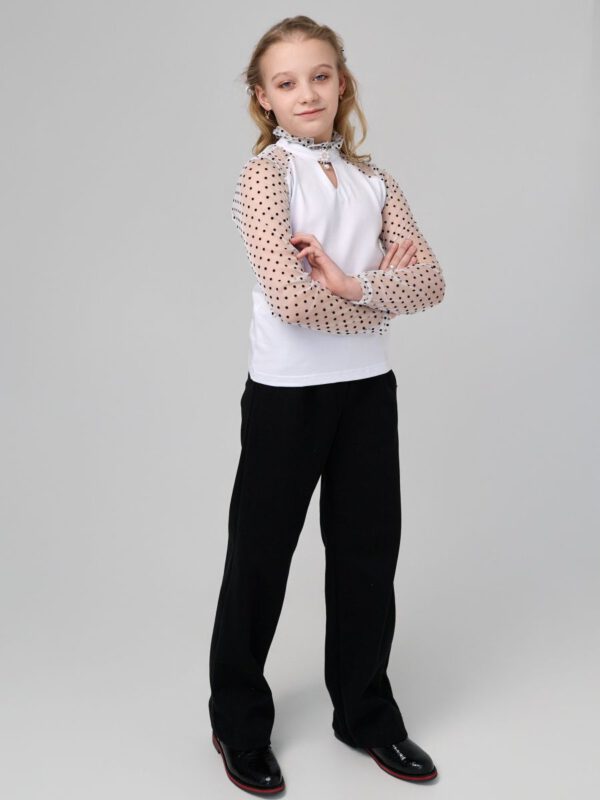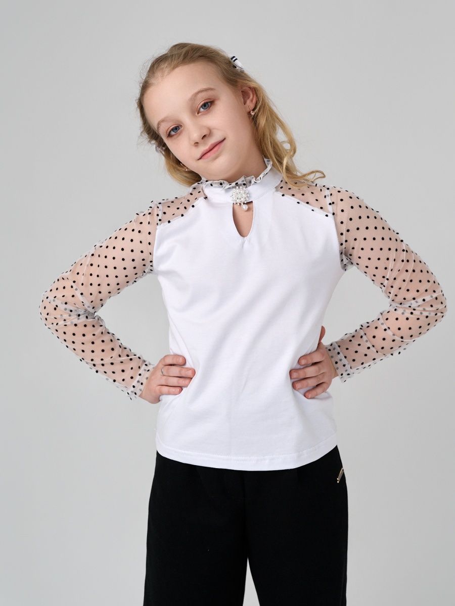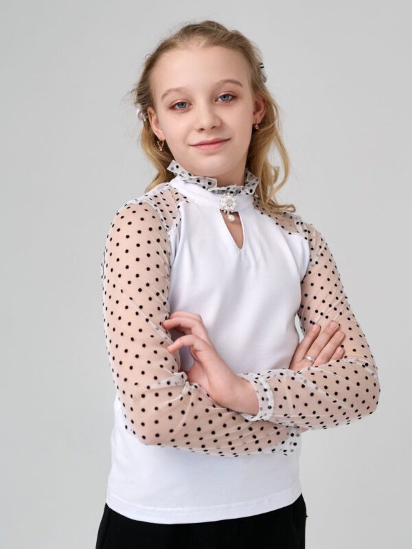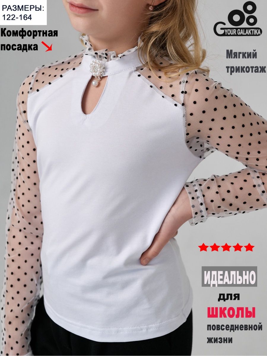 Удобная и нарядная блузка для школы. Сшита из мягкого натурального трикотажа. Что дает возможность девочкам чувствовать себя красивой и свободной в движении. Благодаря трикотажу очень удобная в носке, садится по фигуре, что дает возможность не гладит ее каждый день перед школой. Декоративная брошь украшает блузку и делает ее еще наряднее. Гипюровые трикотажные рукава дает возможность одеть ее на торжественные мероприятия и не стесняет движения под бомбером или жакетом. Носите с удовольствие одежду “Your Galaktika”. Мы создаем её для Вас с любовью!