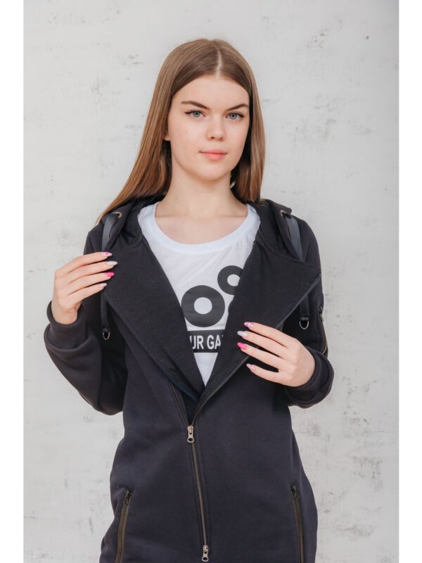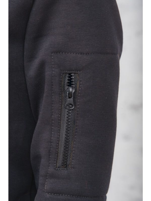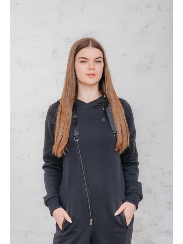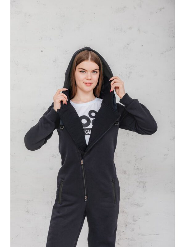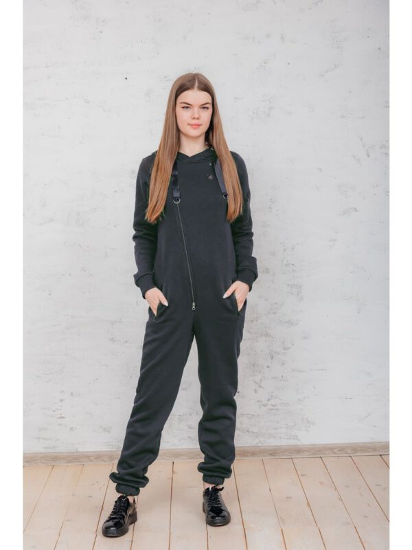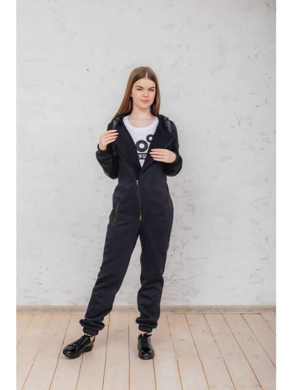 Утепленный женский комбинезон из плотного трикотажа с начесом. Универсальный повседневный комбинезон для прогулок, путешествий, спорта и активного отдыха. Комбинезон мужской выгодно сочетается с верхней одеждой, его можно носить с жилетами, куртками, пуховиками, парками. Объемный стильный капюшон хорошо защищает голову и шею от ветра. Для хранения важных мелочей комбинезон имеет три кармана на молнии, два глубоких на бедрах и один на рукаве. Особое внимание стоит обратить на дизайнерские элементы комбинезона: фирменная нашивка на груди, косая молния