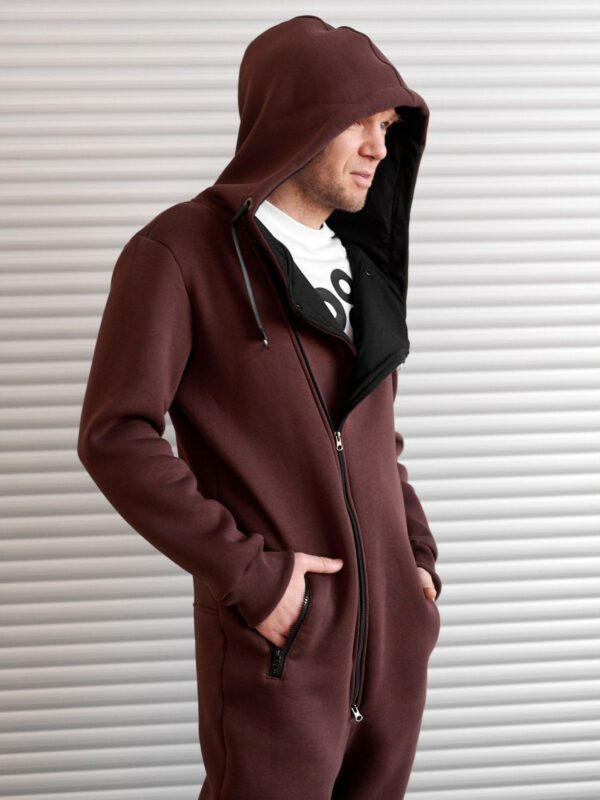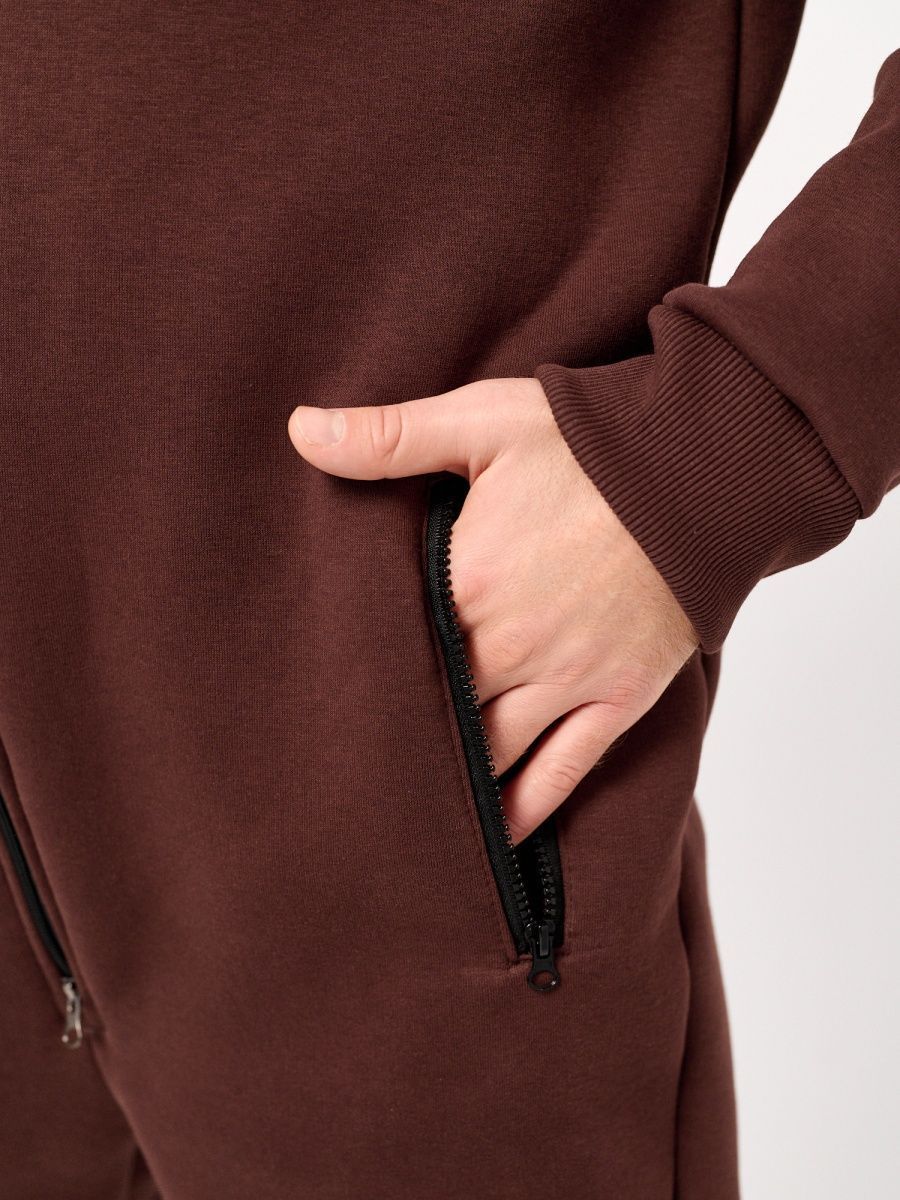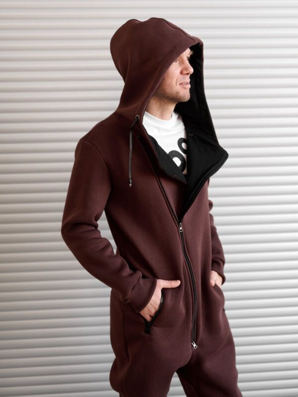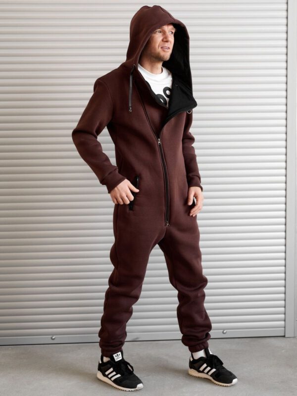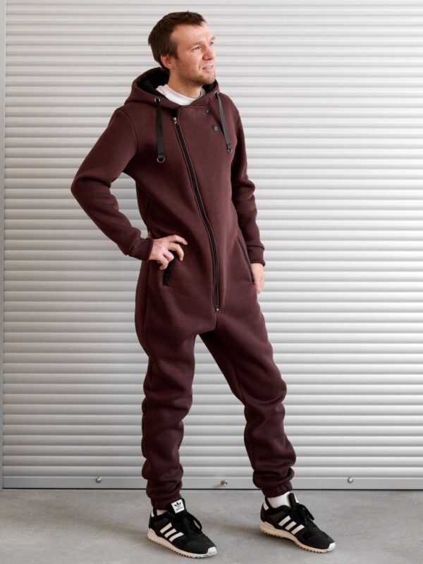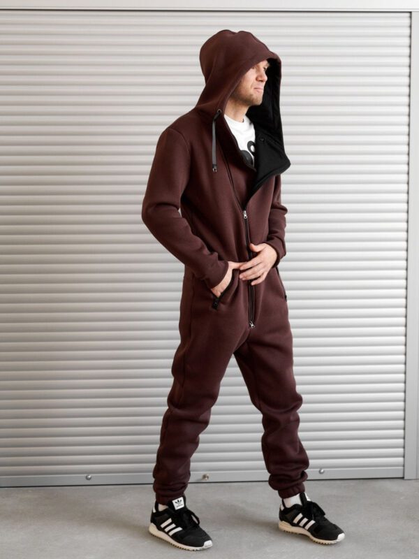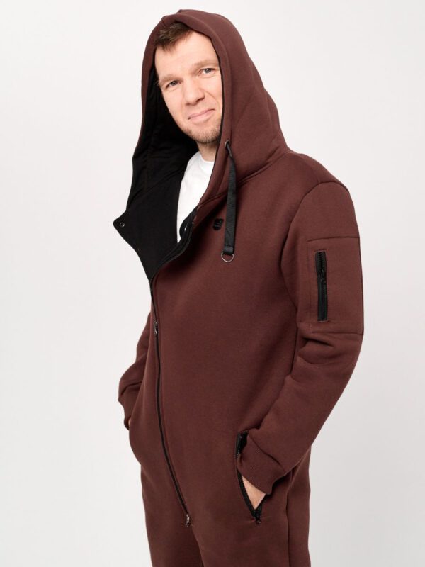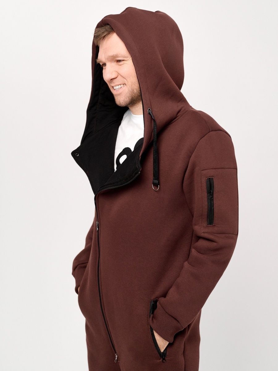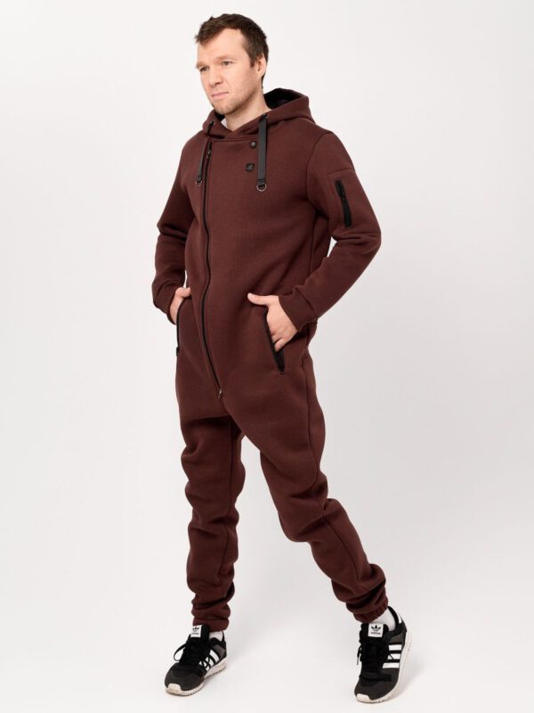 Утепленный мужской комбинезон из плотного трикотажа с начесом. Универсальный повседневный комбинезон для прогулок, путешествий, спорта и активного отдыха. Комбинезон мужской выгодно сочетается с верхней одеждой, его можно носить с жилетами, куртками, пуховиками, парками. Объемный стильный капюшон хорошо защищает голову и шею от ветра. Для хранения важных мелочей комбинезон имеет три кармана на молнии, два глубоких на бедрах и один на рукаве. Особое внимание стоит обратить на дизайнерские элементы комбинезона: фирменная нашивка на груди, косая молния