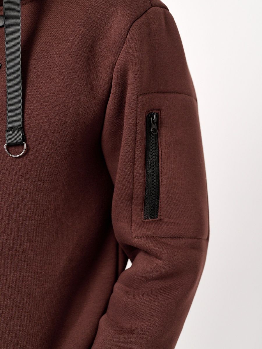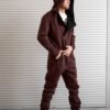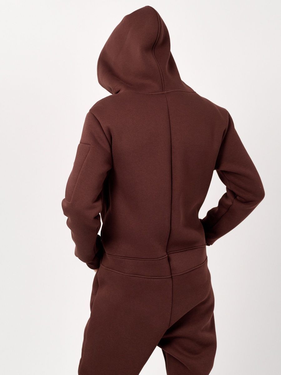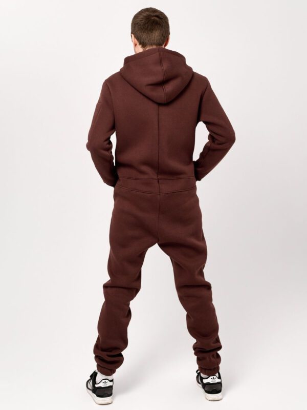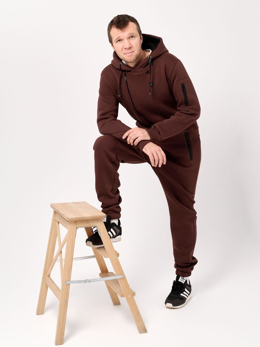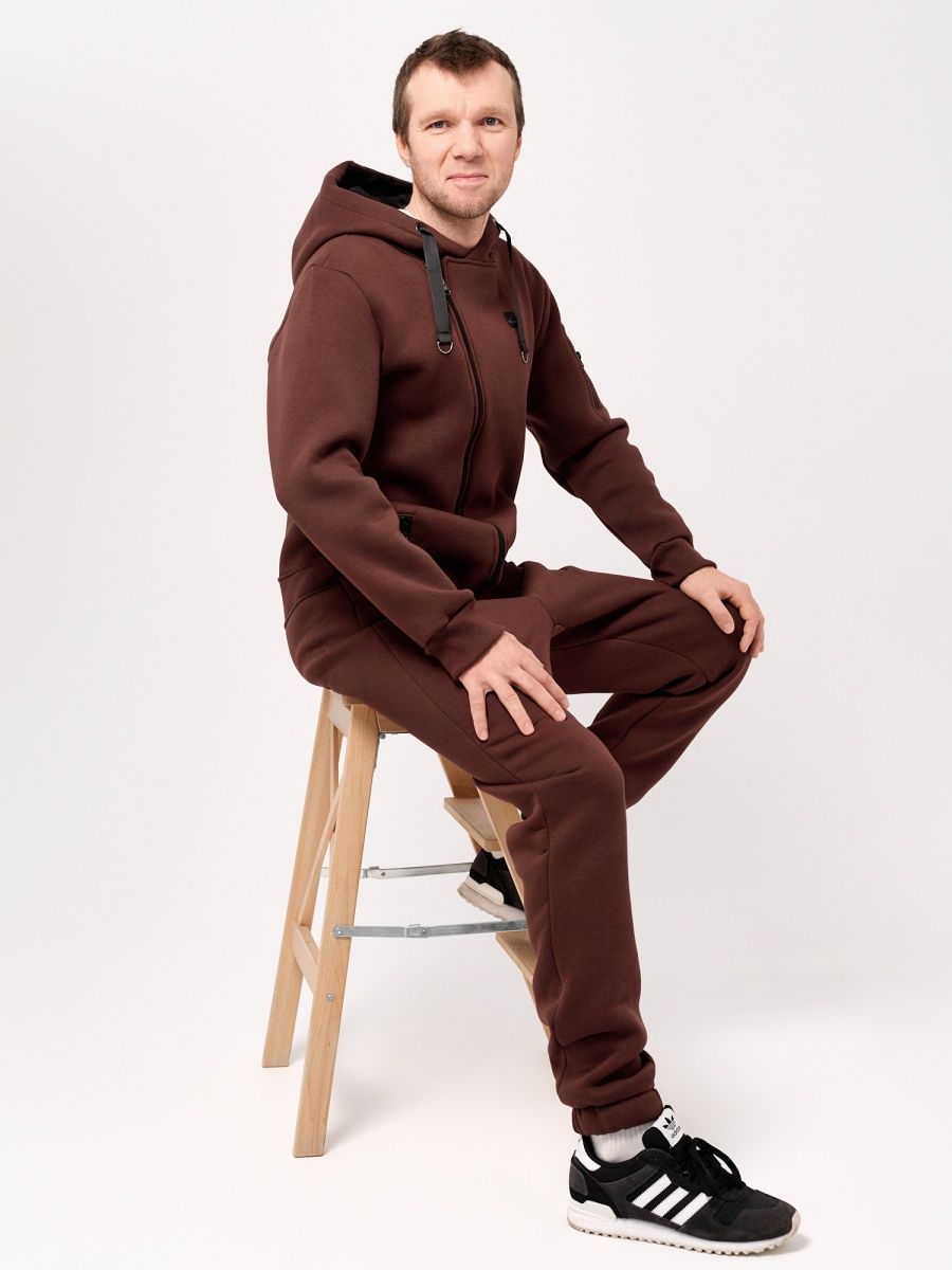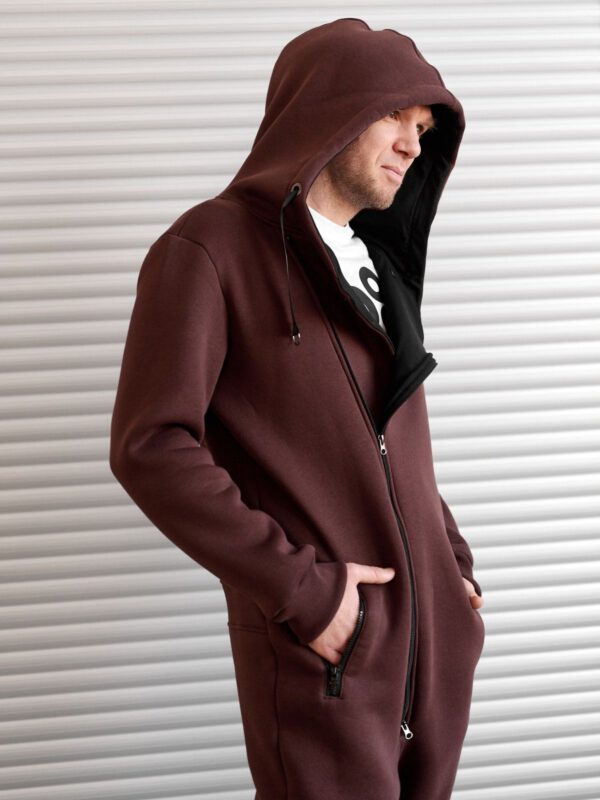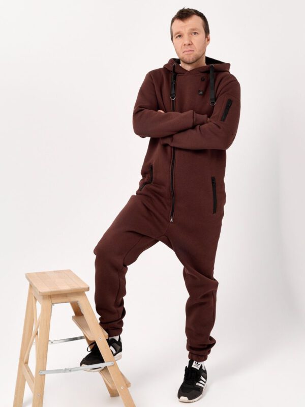 Утепленный мужской комбинезон из плотного трикотажа с начесом. Универсальный повседневный комбинезон для прогулок, путешествий, спорта и активного отдыха. Комбинезон мужской выгодно сочетается с верхней одеждой, его можно носить с жилетами, куртками, пуховиками, парками. Объемный стильный капюшон хорошо защищает голову и шею от ветра. Для хранения важных мелочей комбинезон имеет три кармана на молнии, два глубоких на бедрах и один на рукаве. Особое внимание стоит обратить на дизайнерские элементы комбинезона: фирменная нашивка на груди, косая молния