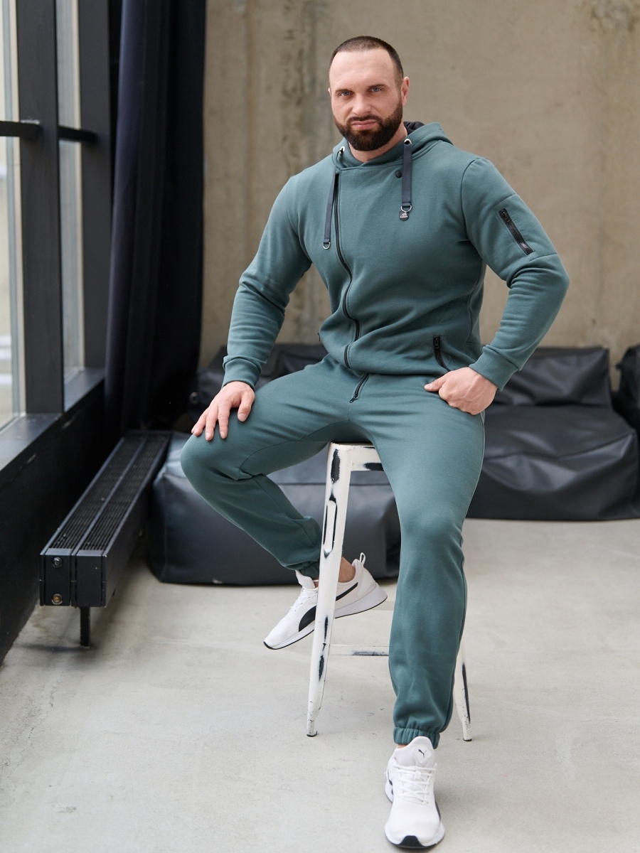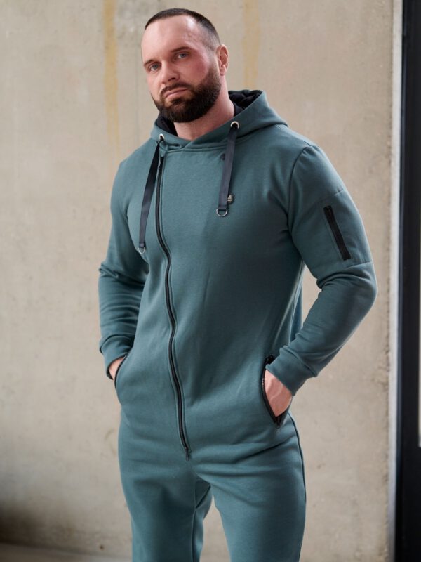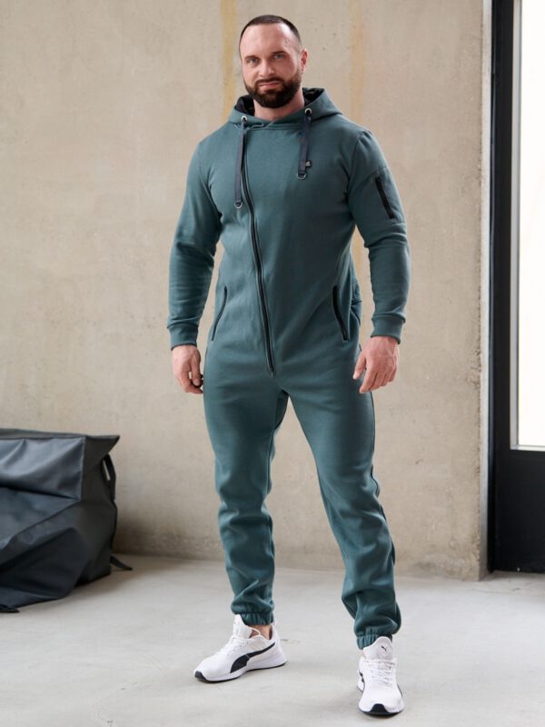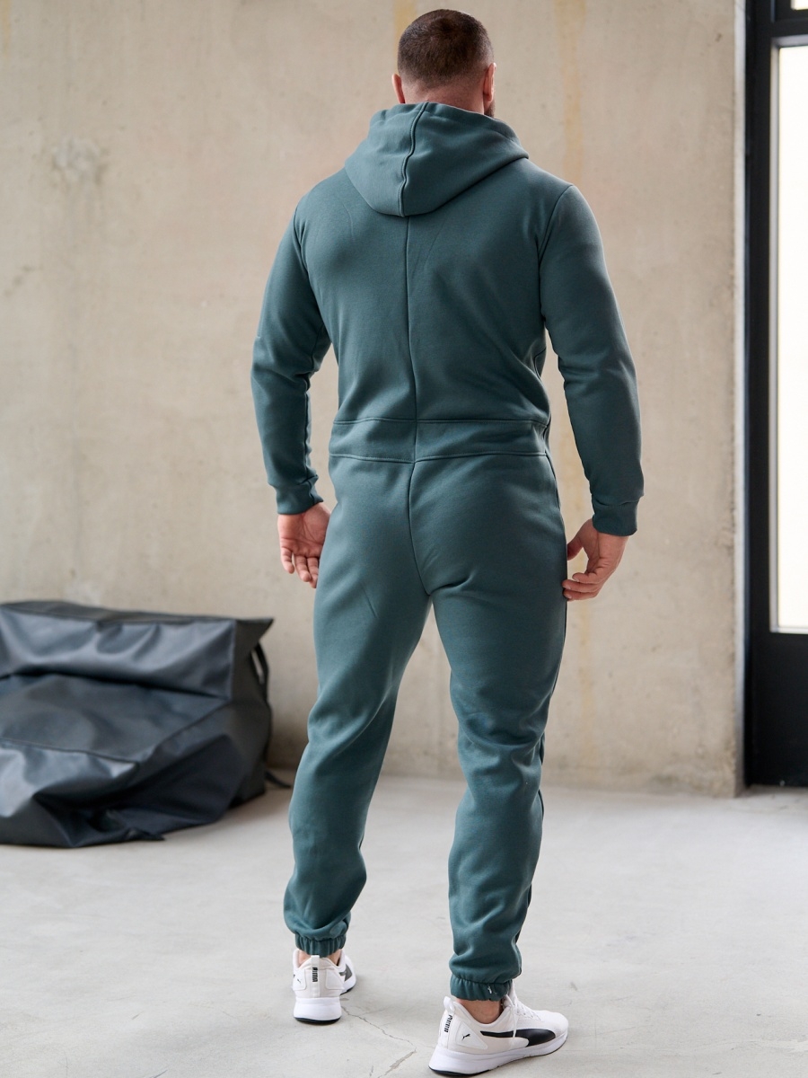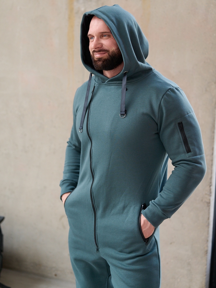 Утепленный мужской комбинезон из плотного трикотажа с начесом. Универсальный повседневный комбинезон для прогулок, путешествий, спорта и активного отдыха. Комбинезон мужской выгодно сочетается с верхней одеждой, его можно носить с жилетами, куртками, пуховиками, парками. Объемный стильный капюшон хорошо защищает голову и шею от ветра. Для хранения важных мелочей комбинезон имеет три кармана на молнии, два глубоких на бедрах и один на рукаве. Особое внимание стоит обратить на дизайнерские элементы комбинезона: фирменная нашивка на груди, косая молния