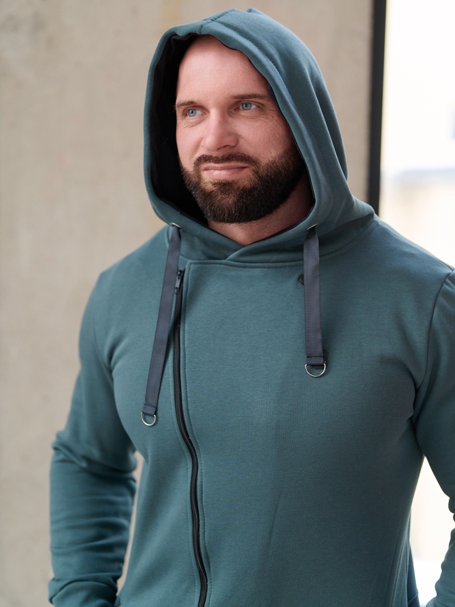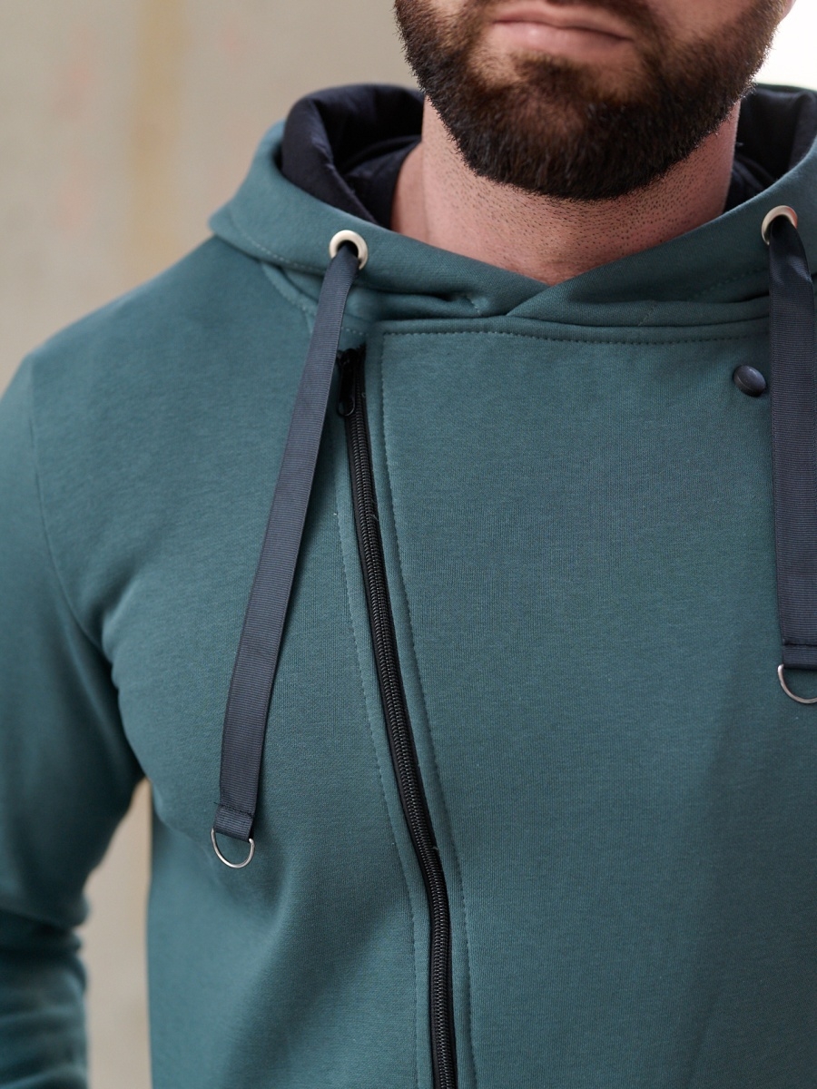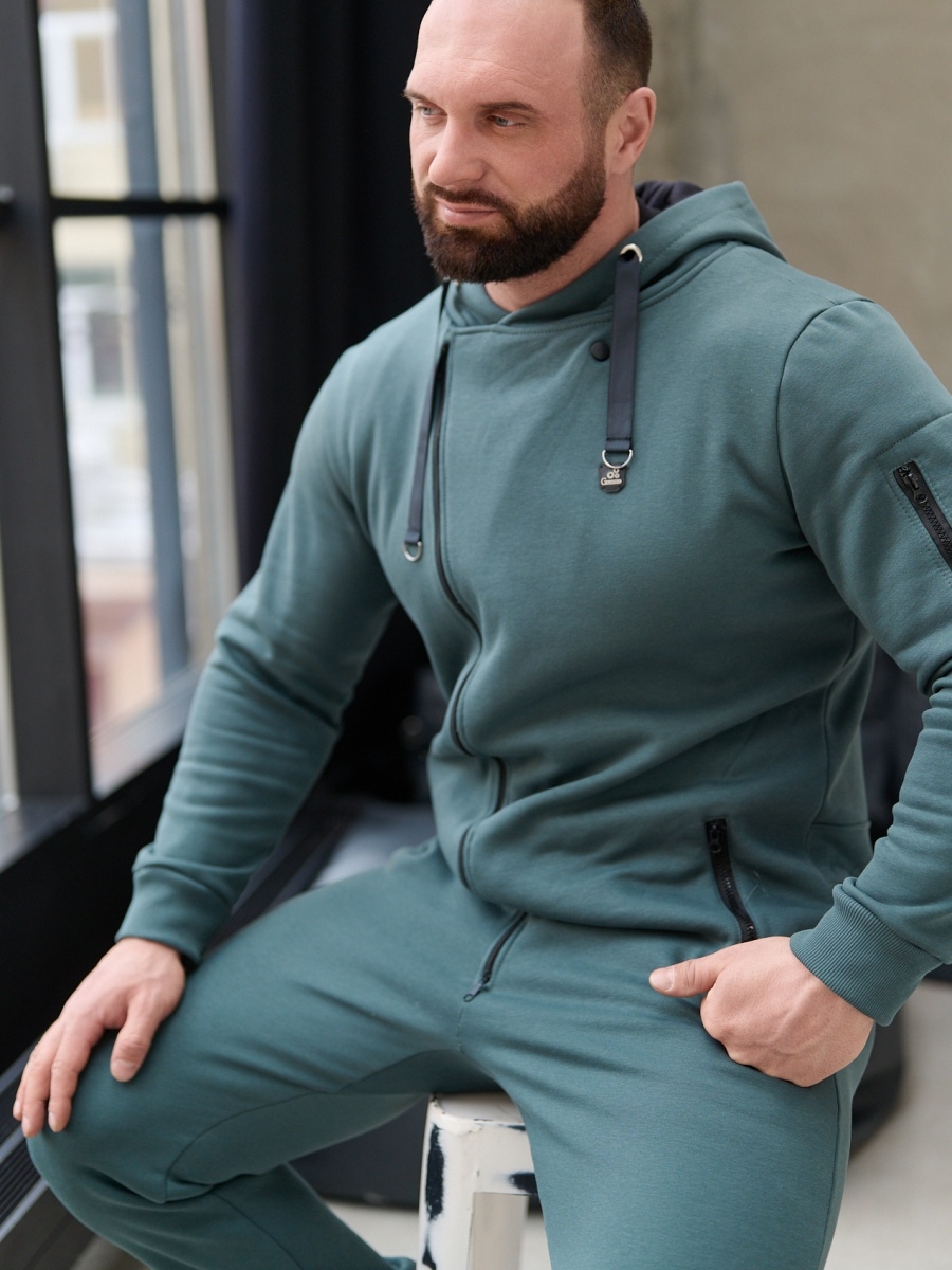 Утепленный мужской комбинезон из плотного трикотажа с начесом. Универсальный повседневный комбинезон для прогулок, путешествий, спорта и активного отдыха. Комбинезон мужской выгодно сочетается с верхней одеждой, его можно носить с жилетами, куртками, пуховиками, парками. Объемный стильный капюшон хорошо защищает голову и шею от ветра. Для хранения важных мелочей комбинезон имеет три кармана на молнии, два глубоких на бедрах и один на рукаве. Особое внимание стоит обратить на дизайнерские элементы комбинезона: фирменная нашивка на груди, косая молния