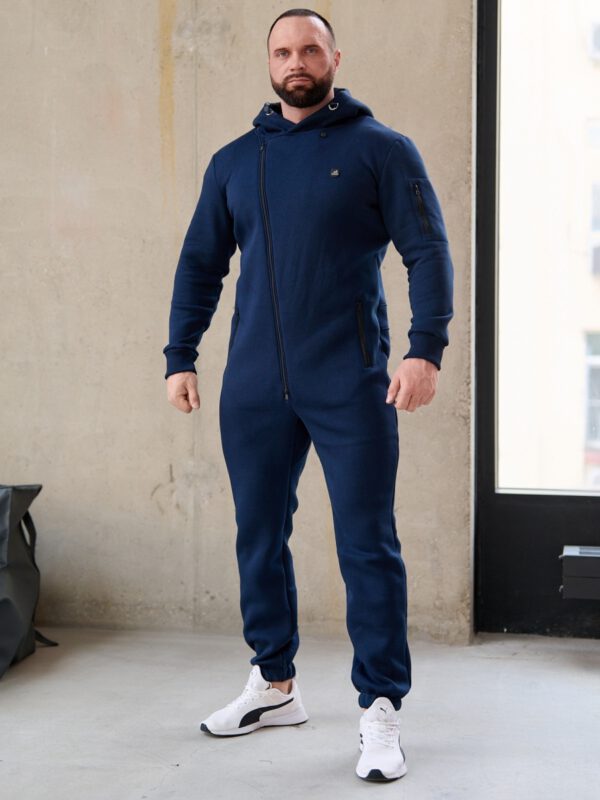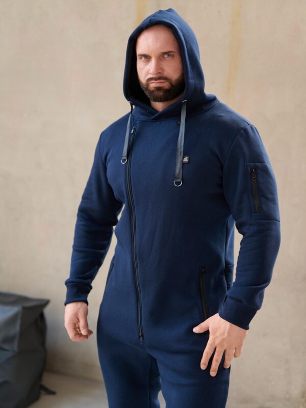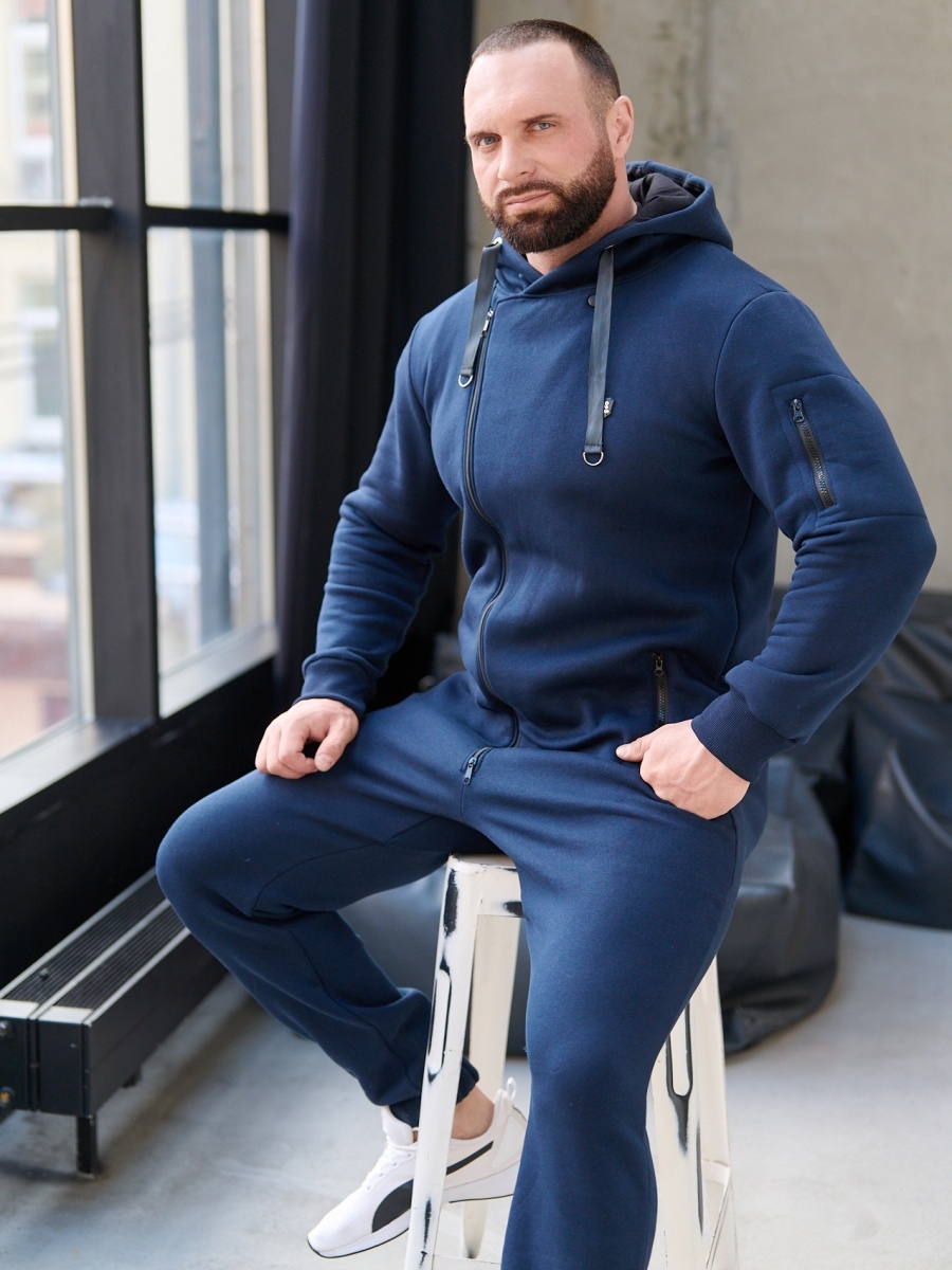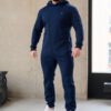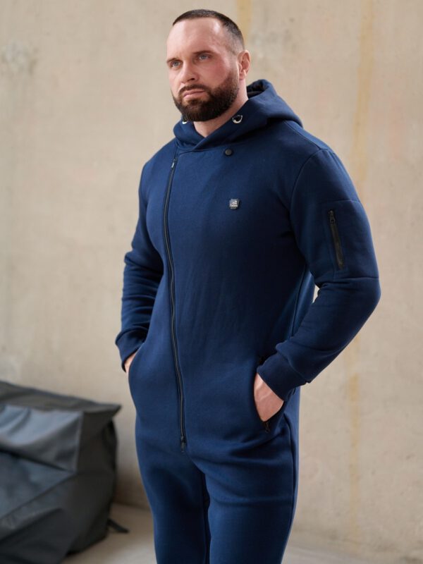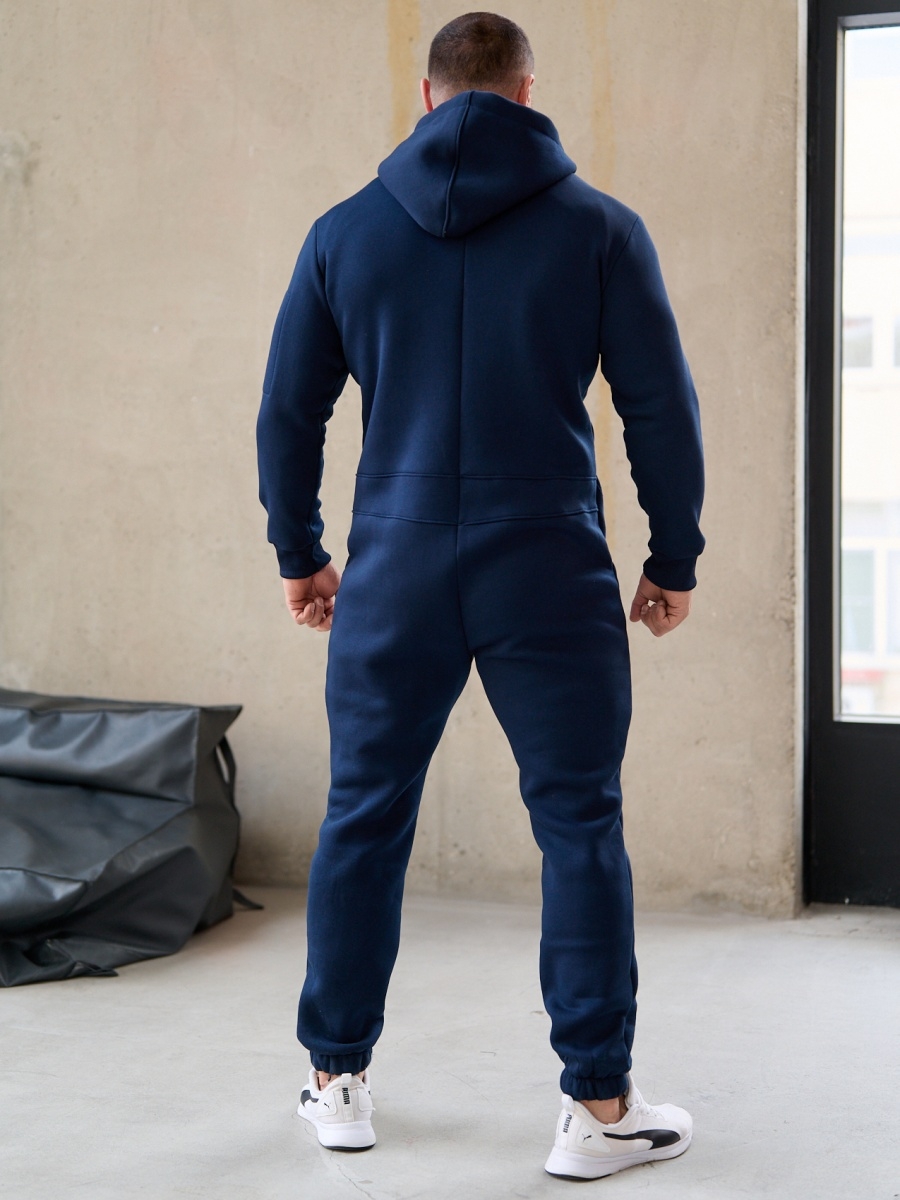 Утепленный мужской комбинезон из плотного трикотажа с начесом. Универсальный повседневный комбинезон для прогулок, путешествий, спорта и активного отдыха. Комбинезон мужской выгодно сочетается с верхней одеждой, его можно носить с жилетами, куртками, пуховиками, парками. Объемный стильный капюшон хорошо защищает голову и шею от ветра. Для хранения важных мелочей комбинезон имеет три кармана на молнии, два глубоких на бедрах и один на рукаве. Особое внимание стоит обратить на дизайнерские элементы комбинезона: фирменная нашивка на груди, косая молния