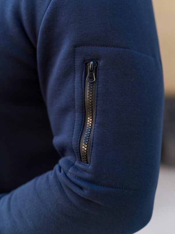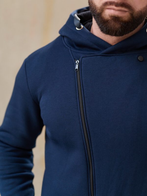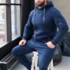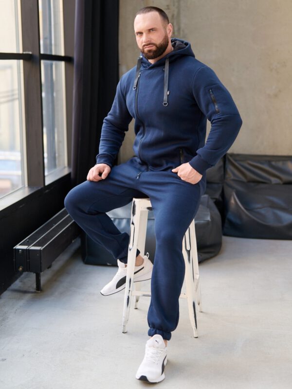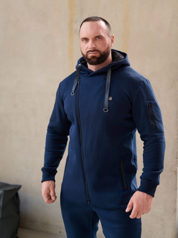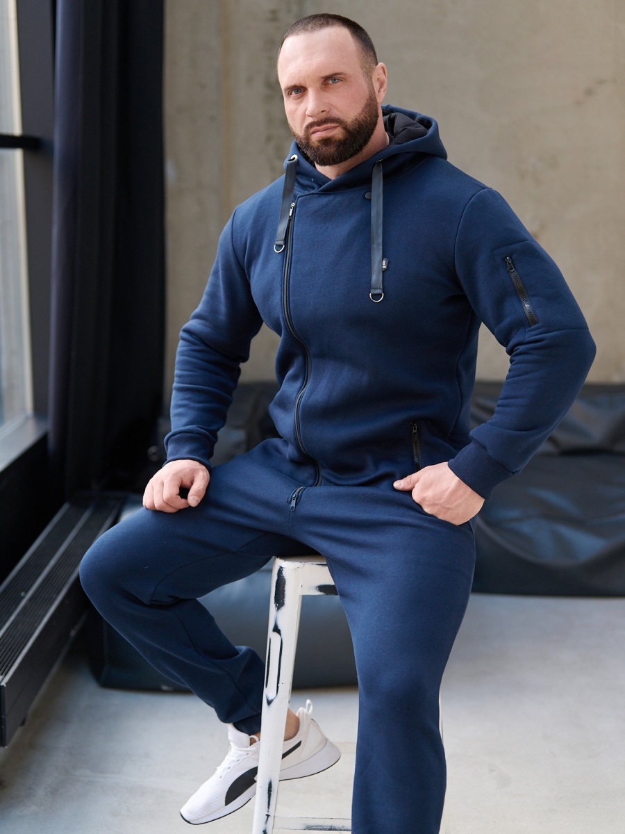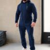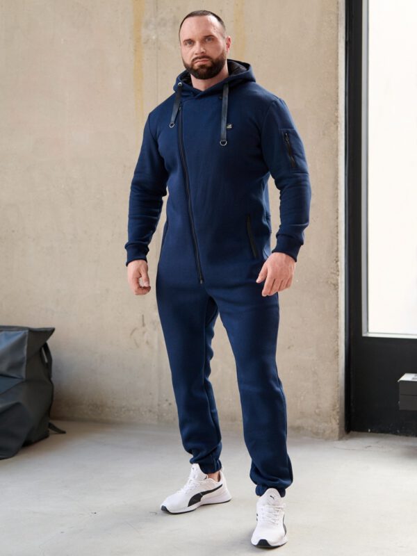 Утепленный мужской комбинезон из плотного трикотажа с начесом. Универсальный повседневный комбинезон для прогулок, путешествий, спорта и активного отдыха. Комбинезон мужской выгодно сочетается с верхней одеждой, его можно носить с жилетами, куртками, пуховиками, парками. Объемный стильный капюшон хорошо защищает голову и шею от ветра. Для хранения важных мелочей комбинезон имеет три кармана на молнии, два глубоких на бедрах и один на рукаве. Особое внимание стоит обратить на дизайнерские элементы комбинезона: фирменная нашивка на груди, косая молния