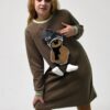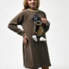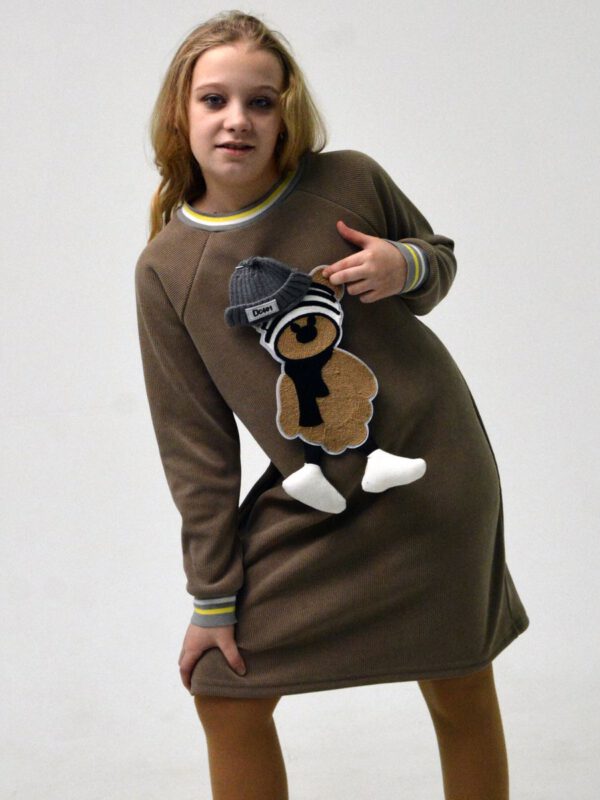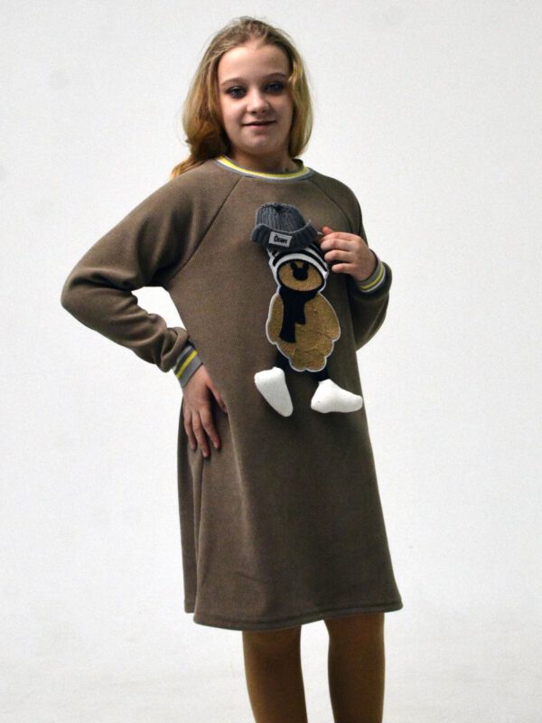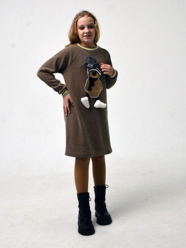 Тепловое велюровое стрейч платье. Свободный крой, трендовая нашивка в виде мишки сделает Вашу красавицу самой стильной на любой вечеринке. Это платье станет любимой вещью в гардеробе Ваше дочке, внучке или пленяннице. Стрейч-ткань даст свободу в движении, красивые подвязы на рукавах и горловине дадут мягкое облегание, и конечно же замечательный Мишка, шапка которого связана отдельно и мягкие объемные ботиночки не оставят никого равнодушным) Наслаждайтесь и носите с удовольствием!