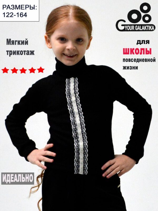 Удобная нарядная водолазка для школы, из мягкого комфортного материала. Воротник-стоечка мягко облегает и отлично тянется. По полочки водолазка декорированная двухсторонними рюшами с жемчужными бусинами. что придает праздничность и изысканности изделию. Носите долго и с удовольствие! Сделано с любовью! Все товары брэнда ” Galaktika” подтверждены сертификатами качества.